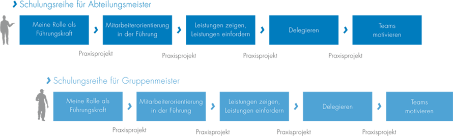 Die Abteilungsmeister beginnen mit Modul 1, dann erfolgen die Schulungen im Wechsel Gruppen-/Abteilungsmeister. Für die Gruppenmeisterschulungen wird jeweils ein Abteilungsmeister als Co-/Fachtrainer hinzugezogen. Hiermit ist gewährleistet, dass alle Führungskräfte „die gleiche Sprache sprechen“ und zudem, dass die Gruppenmeister praxisrelevante Fragen direkt bei einem Abteilungsmeister ansprechen können. In der Regel reicht es, dass der Abteilungsmeister nur einen halben Tag anwesend ist. Zwischen den Modulen bekommen die Teilnehmer kleine Praxisprojekte/Aufgaben, die sich aus dem Seminar heraus ergeben.